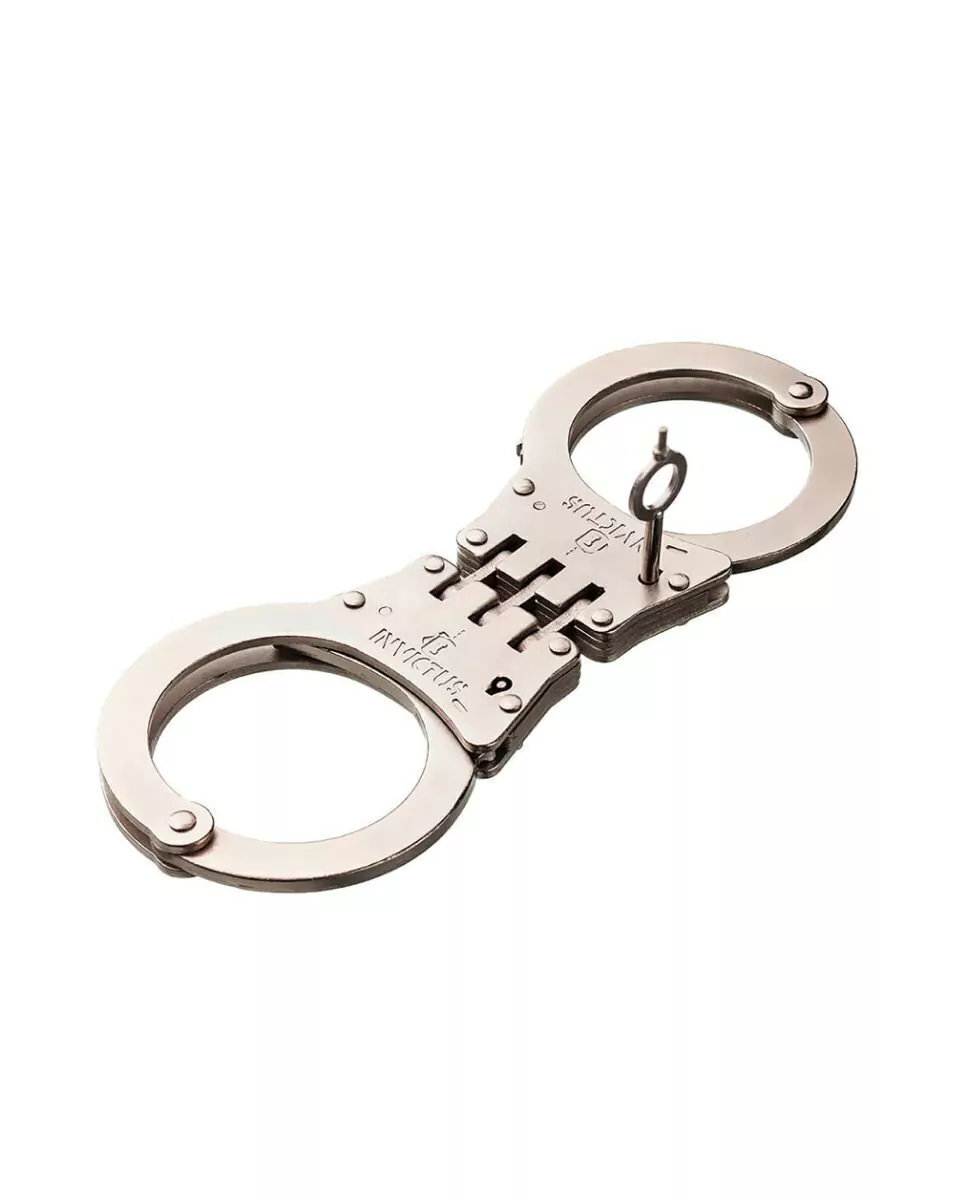 A Algema de Dobradiça Invictus é um modelo de algema de pulso interligada por dobradiça e possui sistema de fechamento dentado através de catracas. O modelo conta ainda com mecanismo de segurança para evitar lesão no uso, acionado pela chave do produto. Fabricada em aço carbono AISI 1020, tem tratamento da superfície niquelado na cor prata, com acabamento fosco para adquirir a característica de antirreflexo. Acompanha duas chaves em aço carbono AISI 1020 na cor da algema.